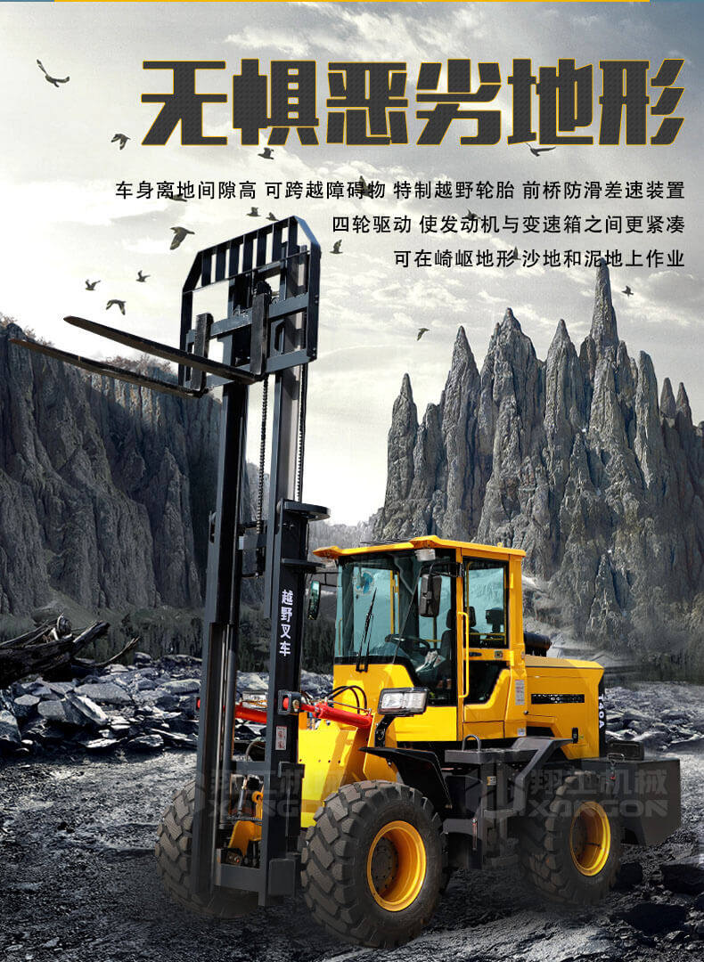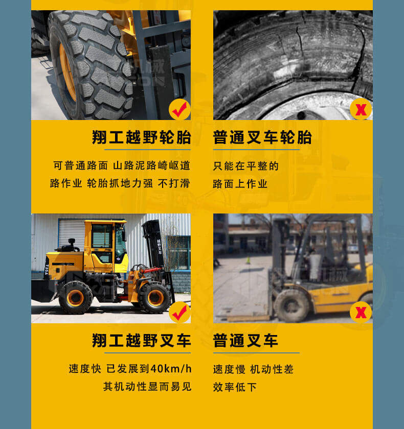 3.普通叉車(chē)只能在平整的路面上作業(yè),而越野叉車(chē)既可以在普通路面上作業(yè),還可以在山路泥路崎嶇道路作業(yè),輪胎抓地力強(qiáng),不打滑。