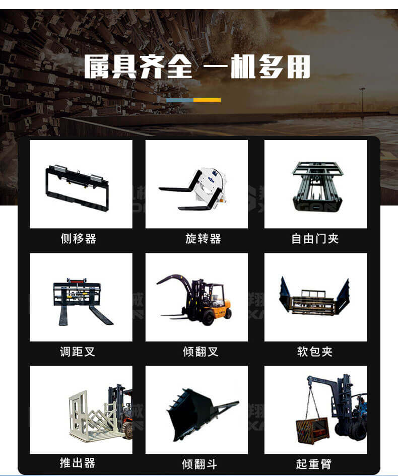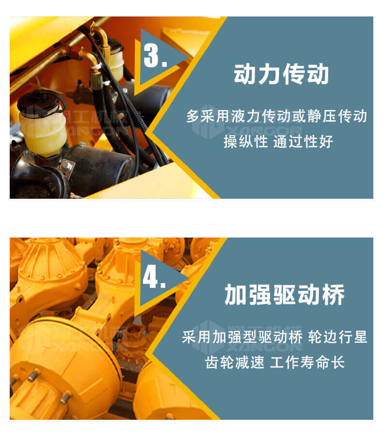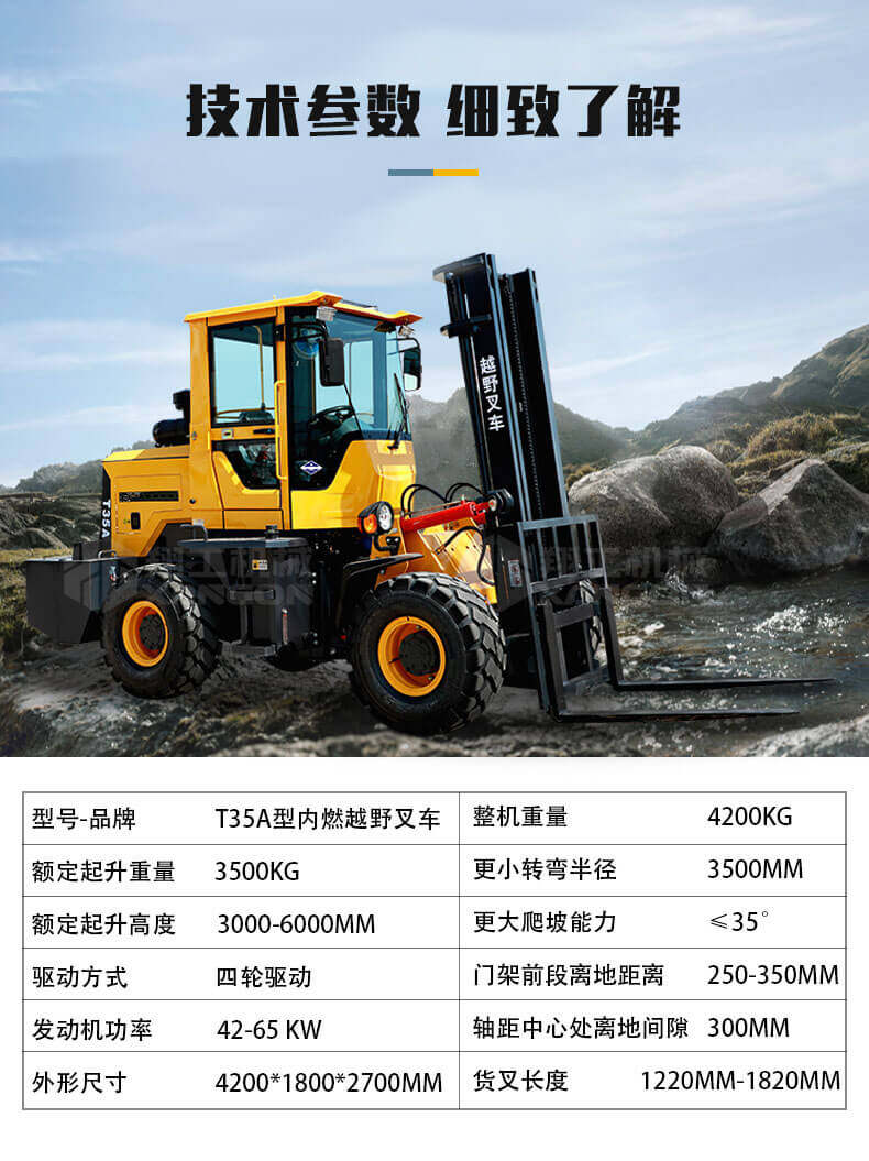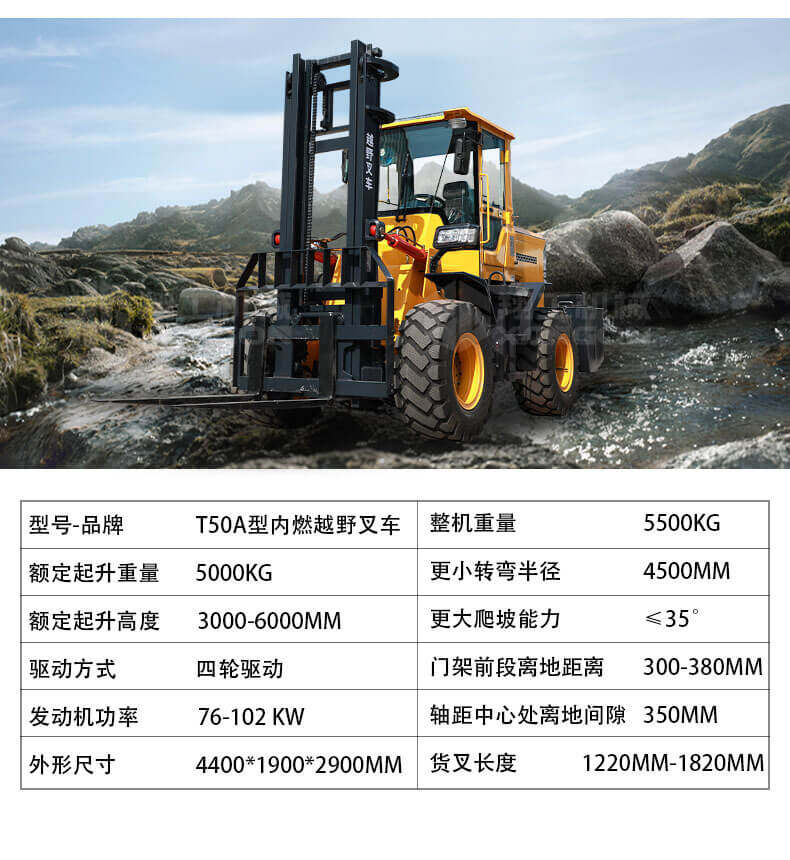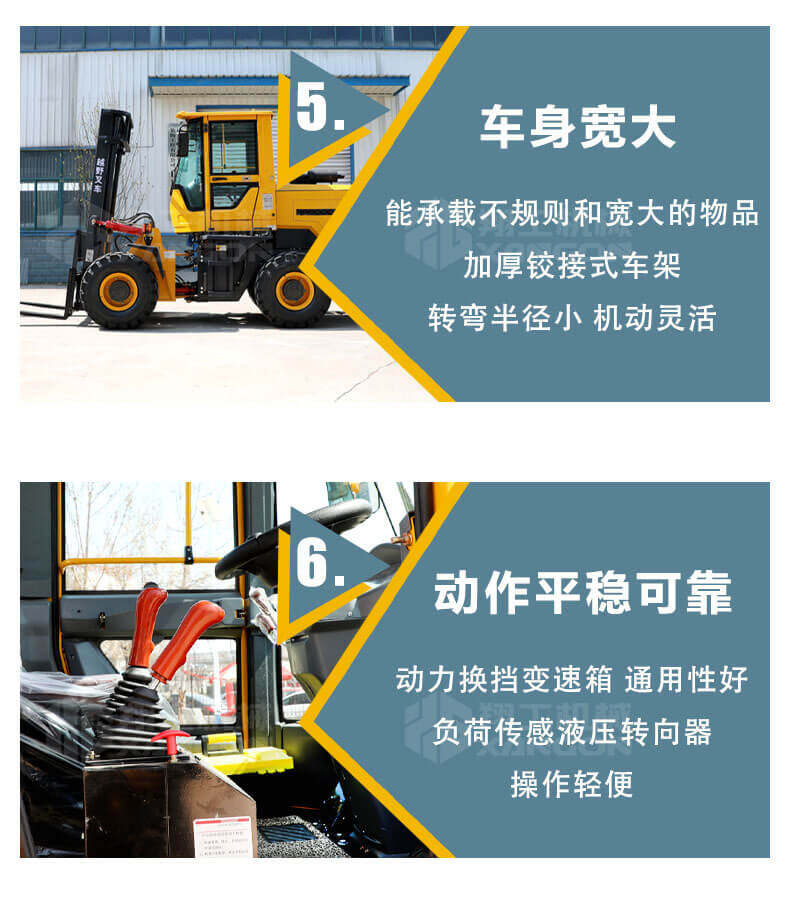 5.越野叉車(chē)發(fā)動(dòng)機(jī)功率大,采用全輪驅(qū)動(dòng)和越野輪胎。