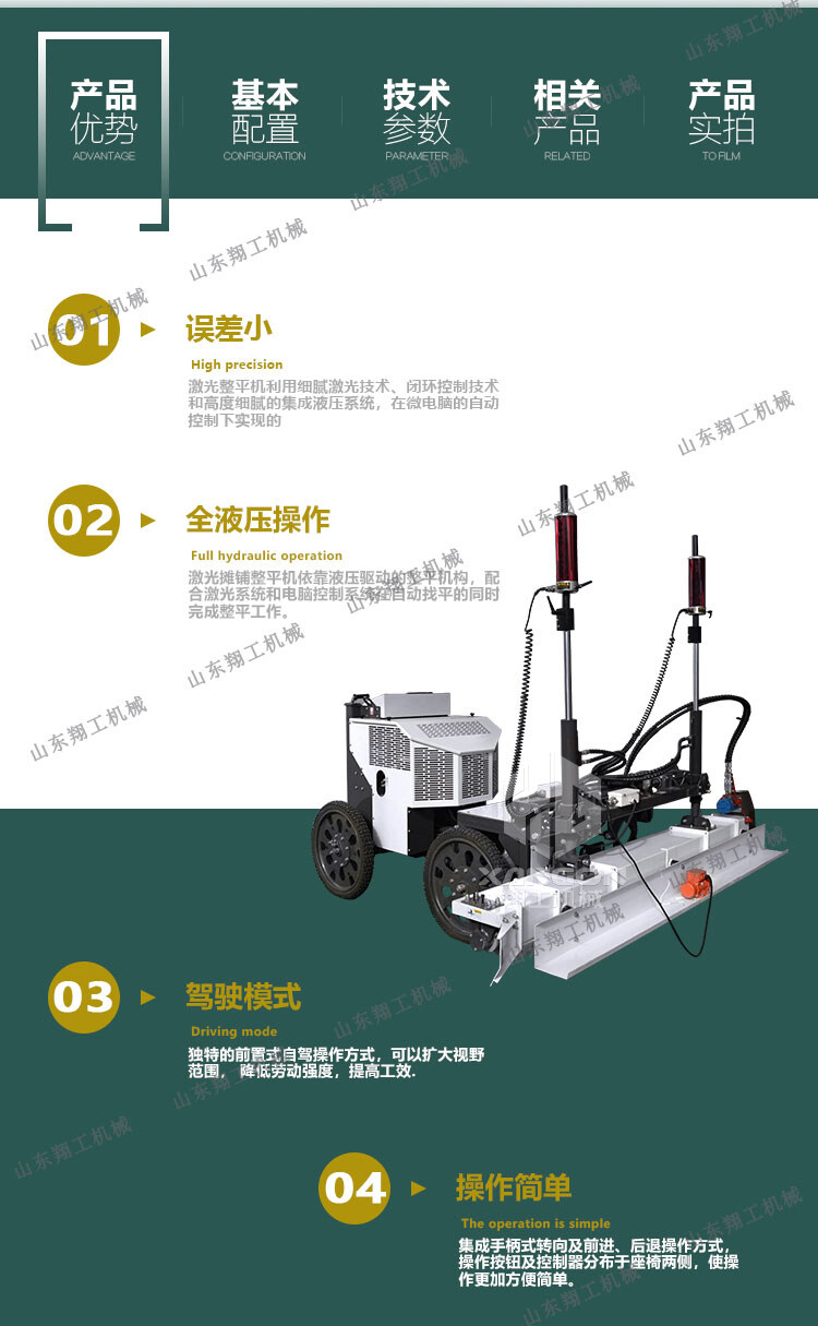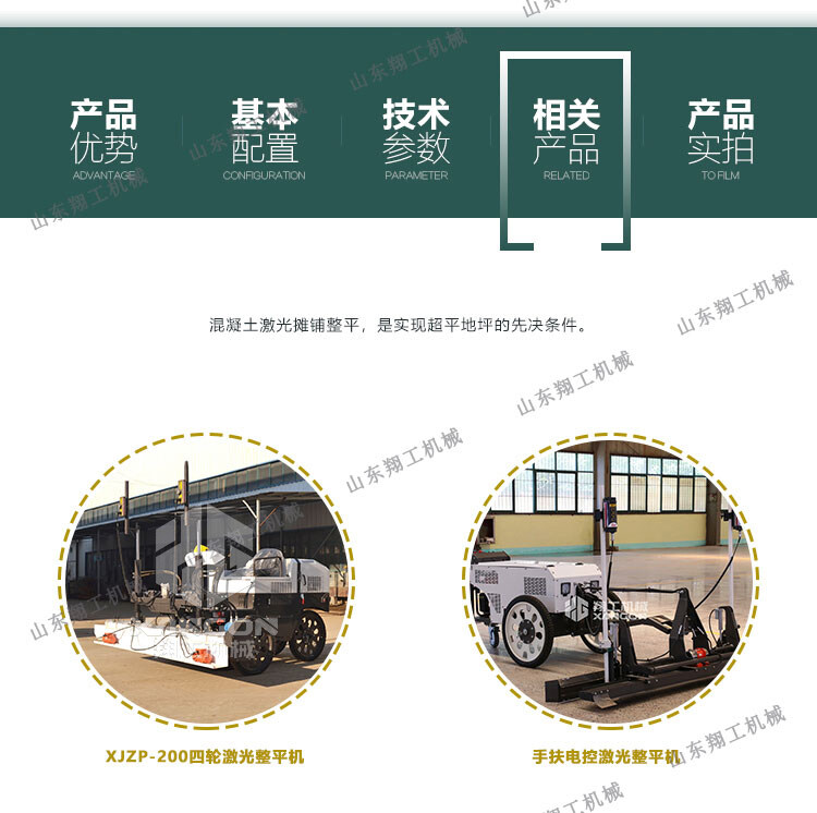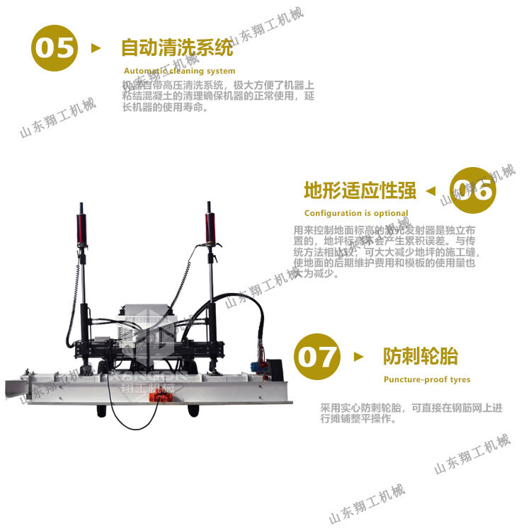 翔工機(jī)械精心研制開發(fā)的激光混凝土整平機(jī)利用先進(jìn)的激光發(fā)射接收系統(tǒng)形成的閉環(huán)回路控制整平板尺的工作,精度高,廣泛用于現(xiàn)代工業(yè)廠房、大型購(gòu)物場(chǎng)所、貨倉(cāng)及其它大面積混凝土地面施工。